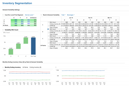 - Segment inventory at any level based on value (revenue or sales volume) and dynamics of consumption or sales (demand variability). Set and adjust customer service levels and see the impact on inventory segments and balances in real time