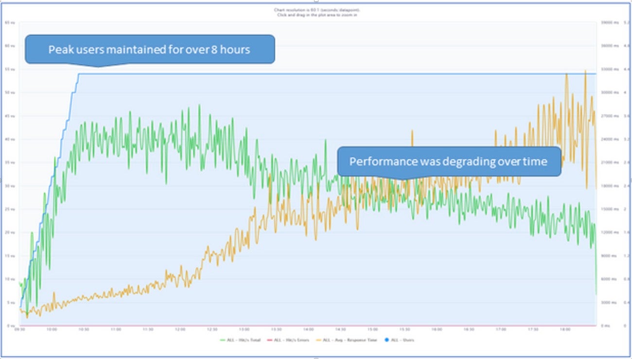By completing user journeys at an accelerated rate and for an extended time, we can observe trend results and extrapolate. We can begin to understand and build a picture of what a production model may be like in the future. For example, in 12 months' time.