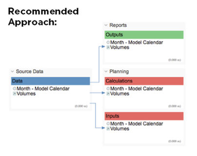 This creates a situation where there's a long dependency chain that has to be calculated. Instead, each module should directly reference the data. The line item in module A is referenced directly in module B and is also referenced directly in module C.